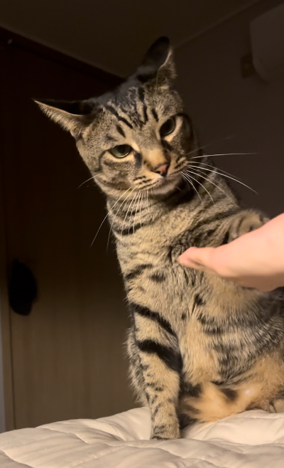 고양이들이 간식이 손 안에 있는 걸 확인했다면, 그걸 꺼내기 위해 냄새를 맡다가 손으로 툭툭 칠 때가 있을 것이고, 그때 손을 열어서 간식 보상을 하면 됩니다.