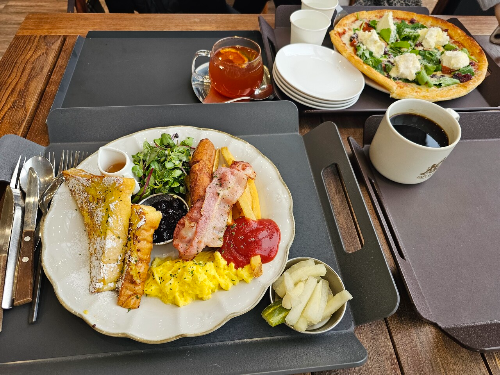 저는 프렌치 토스트, 리코타치즈 피자와 허니자몽티를 주문했어요.