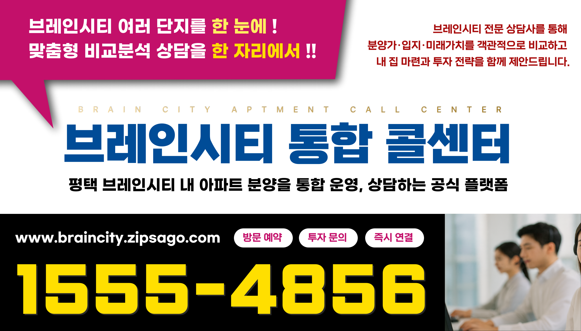 브레인시티 통합 콜센터는 누구나 쉽게 이용할 수 있습니다. 대표번호 1555-4856으로 전화하면, 전담 상담원이 바로 연결됩니다. 상담을 통해 관심 있는 단지를 말씀해주시면, 카카오톡이나 문자로 상세 자료를 받아보실 수 있고, 필요하다면 원하는 날짜에 맞춰 모델하우스 방문 예약까지 가능합니다.